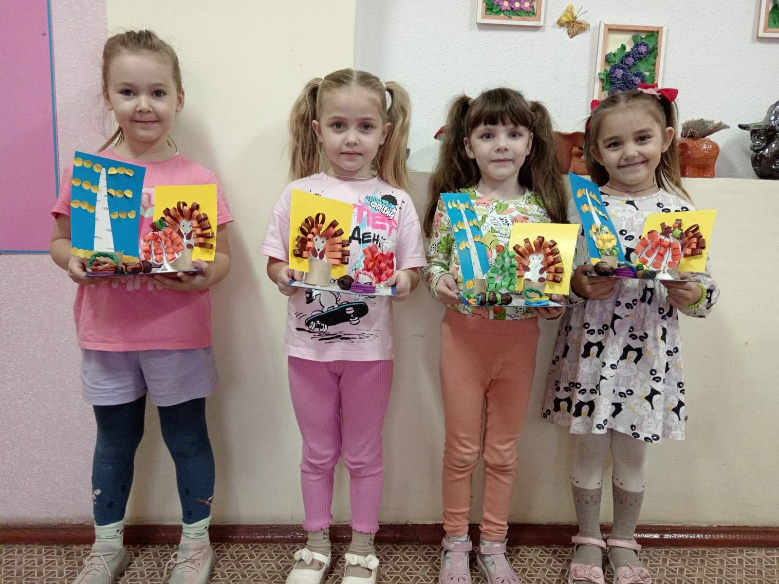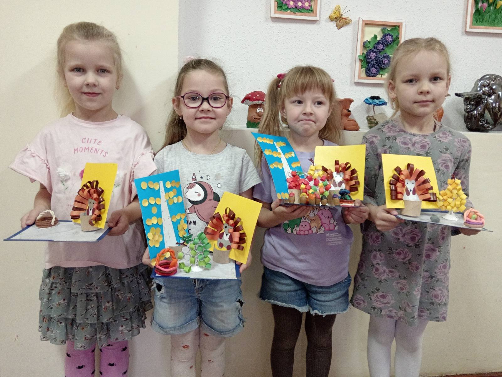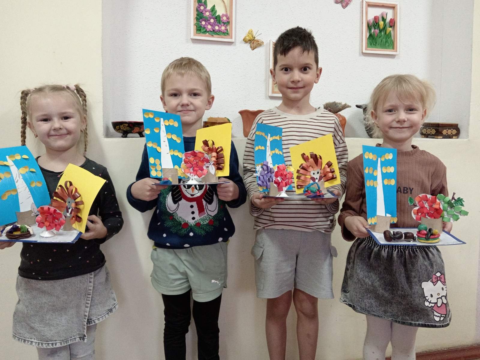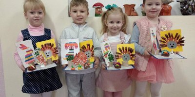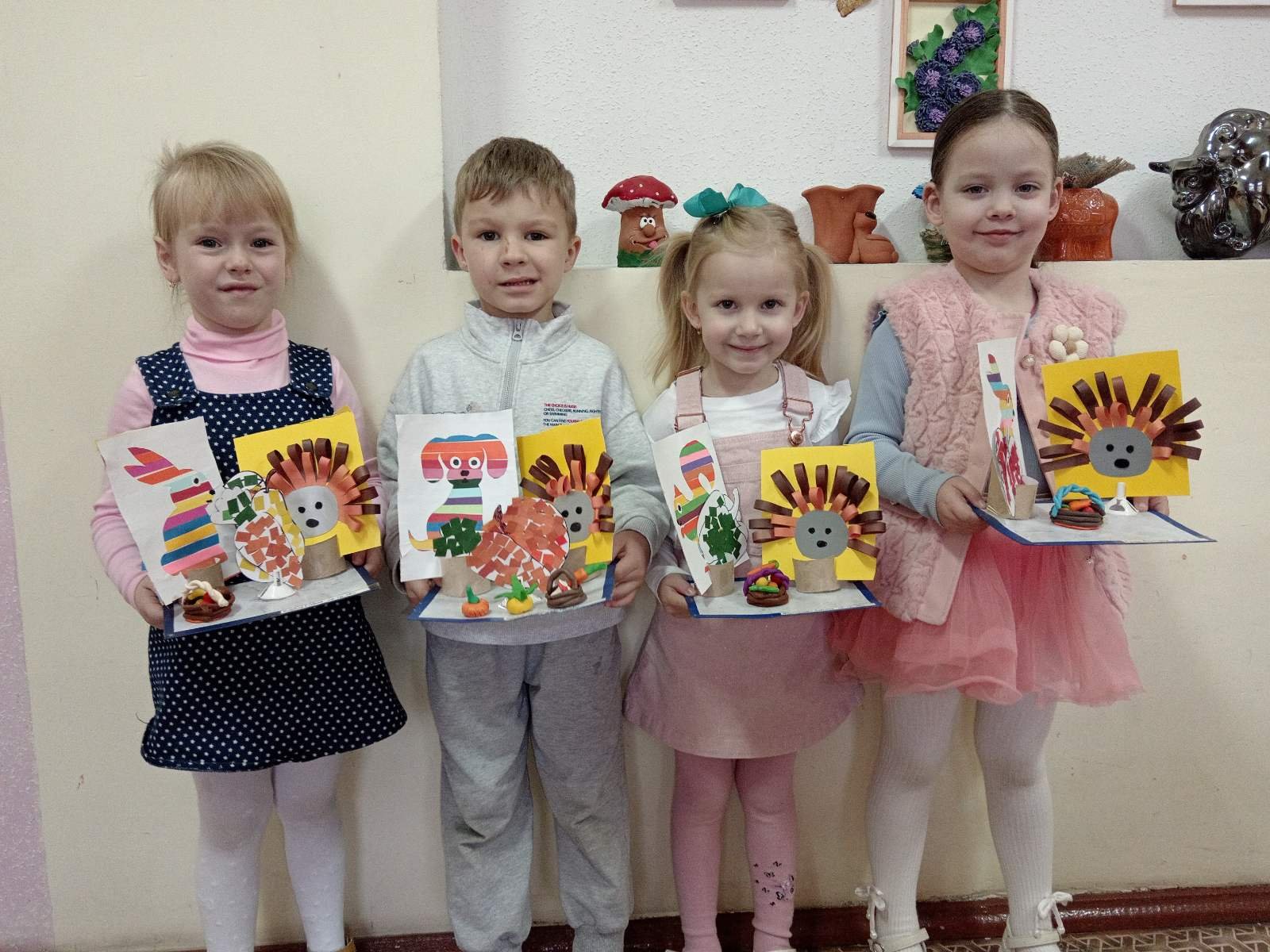 На выставке можно полюбоваться осенним пейзажем, улыбнуться, глядя на забавного ёжика, несущего на своих колючках дары осеннего леса. Овощи и фрукты, сделанные руками мальчиков и девочек смотрятся, как настоящие. А ёще там Вы увидите хоровод весёлых зайчишек и котят, необычных животных, изготовленных из природного материала.
